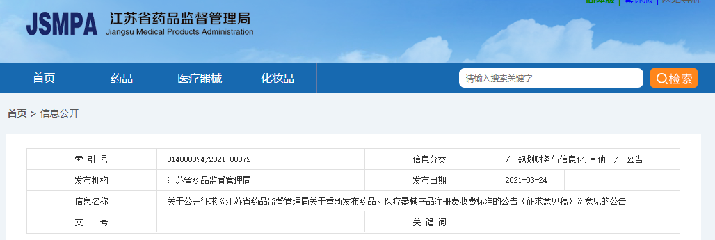 3月24日,江苏省药品监督管理局发布关于公开征求《江苏省药品监督管理局关于重新发布药品、医疗器械产品注册费收费标准的公告(征求意见稿)》意见的公告