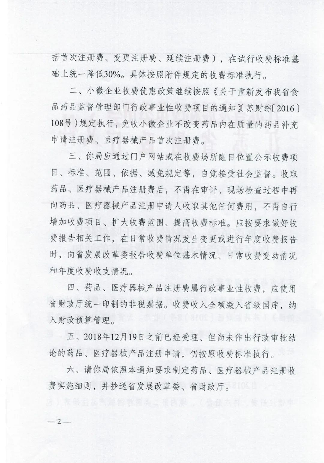 以往规定与本公告不一致的,以本公告为准。 值得注意的是,江苏省药监局针对小微企业提出了优惠政策:小微企业提出的境内第二类医疗器械产品首次注册申请,免收其首次注册费附:江苏省药监局降低注册收费通知原件
